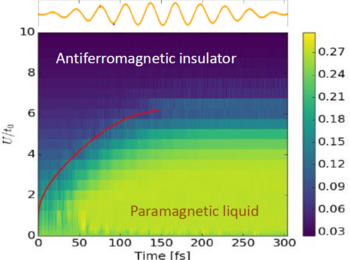 High harmonic spectroscopy of the insulator to metal phase transition in Fermi-Hubbard model. Left panel shows, for each ratio of on-site repulsion U to the hopping parameter t0, how the external field increases the relative number of doublon-hole pairs during the pulse. Right panel shows that high frequency emission is limited to the temporal window during which the phase transition takes place.