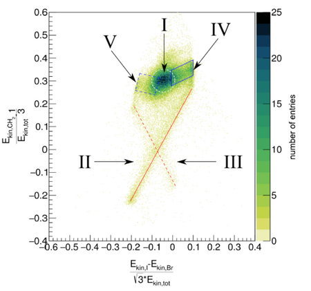 Figure 1: Dalitz plot of the fragments I+, Br+, and CH2+ from explosion of triply charged CH2IBr molecules. “I” marks the direct Coulomb explosion channel, while “II-V” mark different sequential breakup mechanisms of the molecule. For structural imaging, it is important to distinguish the different pathways.