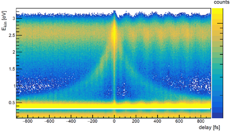 Figure 2: Kinetic energy release of NO2+ fragments from strong-field ionization of N2O4 molecules, as a function of delay between a pump pulse, which excites a vibrational wavepacket, and an intense laser field. The molecular vibration can be accurately characterized from such a measurement.