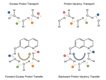 The exchange of protons between two chemical groups (acid-base neutralization) is a textbook chemistry problem for many years. Surprisingly, up to this date new fundamental insight about the elementary steps of proton transport is being obtained. This may well lie in the fact that the elementary steps (by protons or proton vacancies) take place on extremely short time scales, that are not accessible with conventional laboratory techniques (Figure 1). Observation of these elementary reaction steps, as achieved by the research teams of MBI and MLU thus requires direct access to time scales of 1-100 picoseconds (0.000000000001 until 0.0000000001 seconds), necessitating an experimental set-up with an accordingly high time resolution as well as high performance computer systems.