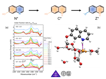 The research teams have jointly studied a particular model system (7-hydroxyquinoline in water/methanol mixtures), where an ultrashort laser pulse triggers the deprotonation of an OH-group and the protonation of a nitrogen atom. The precise chronology of the elementary steps with these class of chemical reactions have remained elusive, leading to numerous speculations. The scientists of the MBI and MLU have now been able to determine that the release of a proton from the OH-group to the solvent is indeed ultrafast, yet the pick-up of a proton by the nitrogen atom is even faster. This results in a transport mechanism of proton vacancies, i.e. of hydroxide/methoxide ions. The elementary reaction steps have been elucidated with time-resolved IR spectra and detailed quantum chemical calculations (see Figure 2).