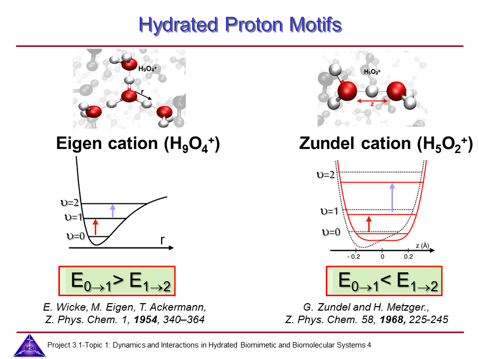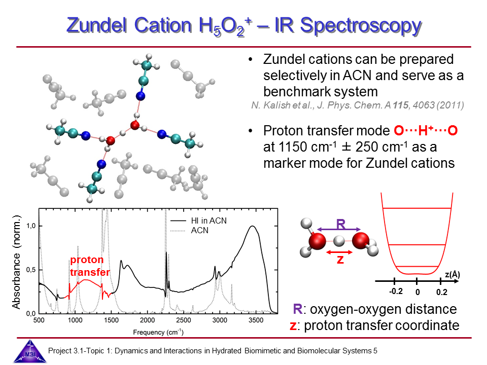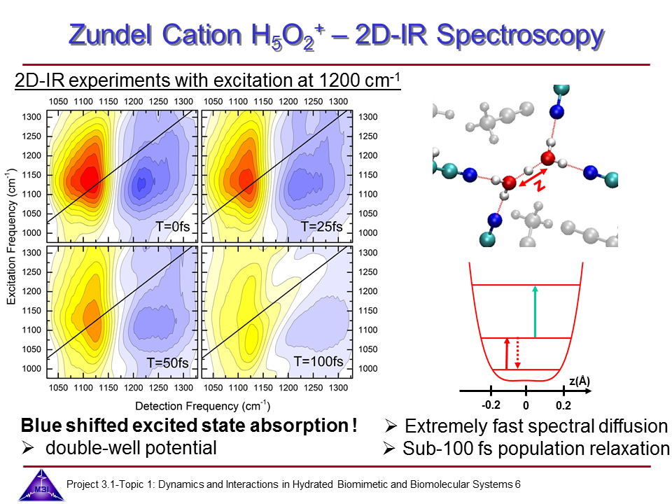 6. 2D-IR spectroscopy of the proton transfer mode of the Zundel cation H5O2+ in CH3CN unequivocally demonstrates its potential double well character subject to extremely fast electric field-driven fluctuations and concomittant spectral diffusion and vibrational redistribution.