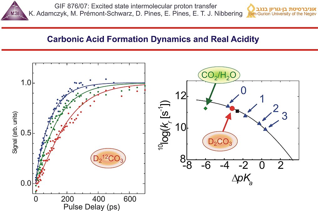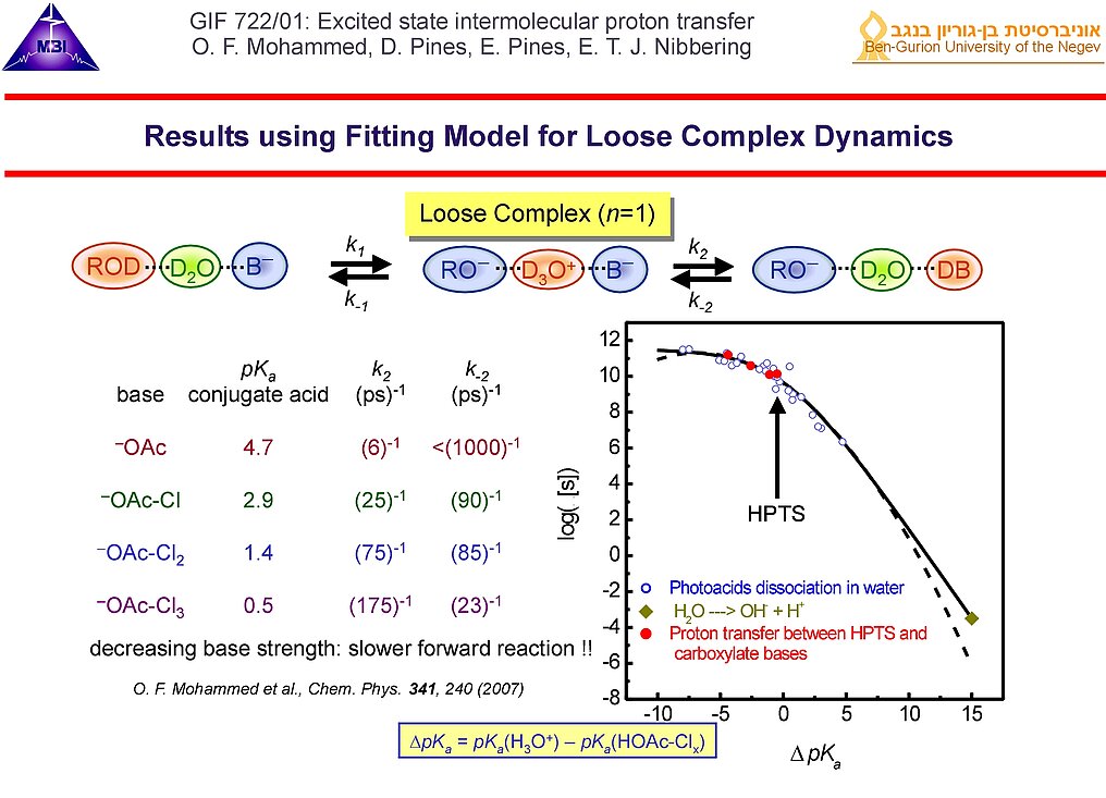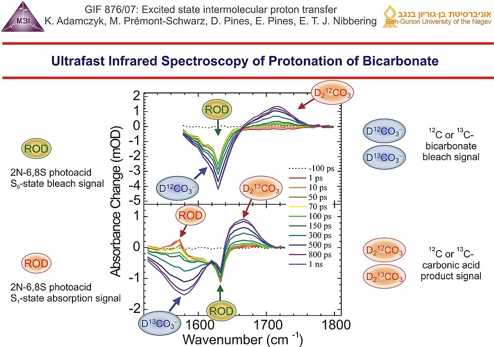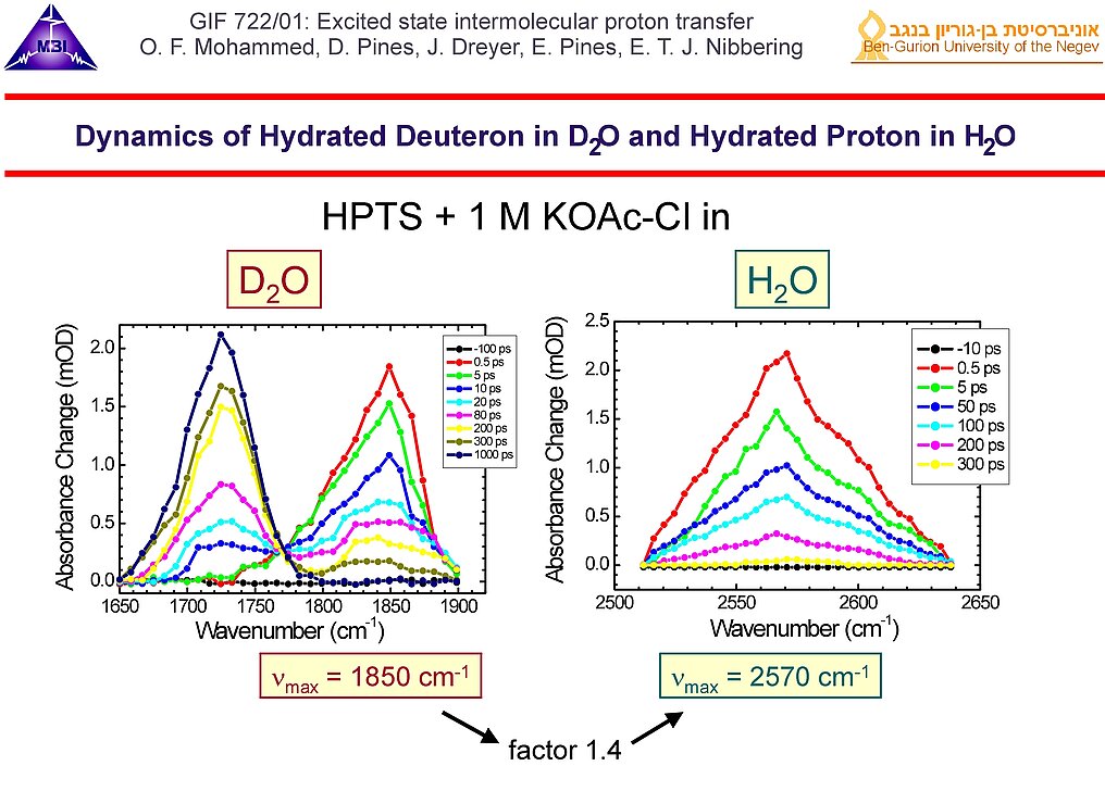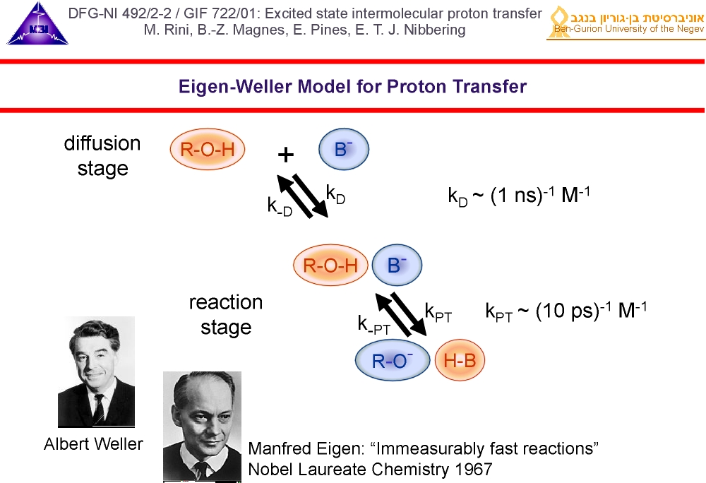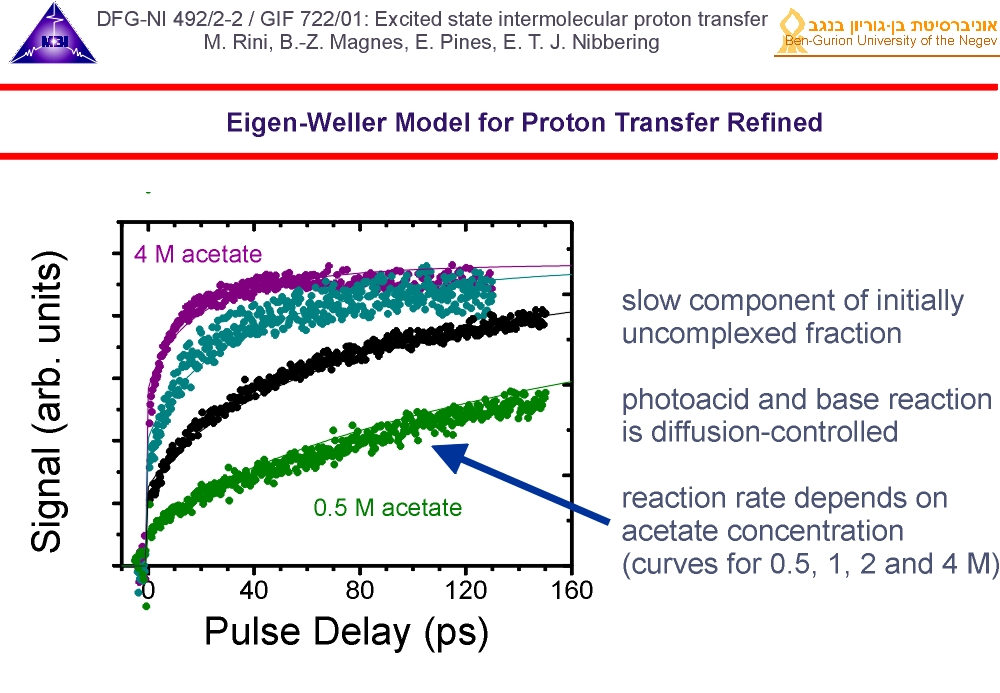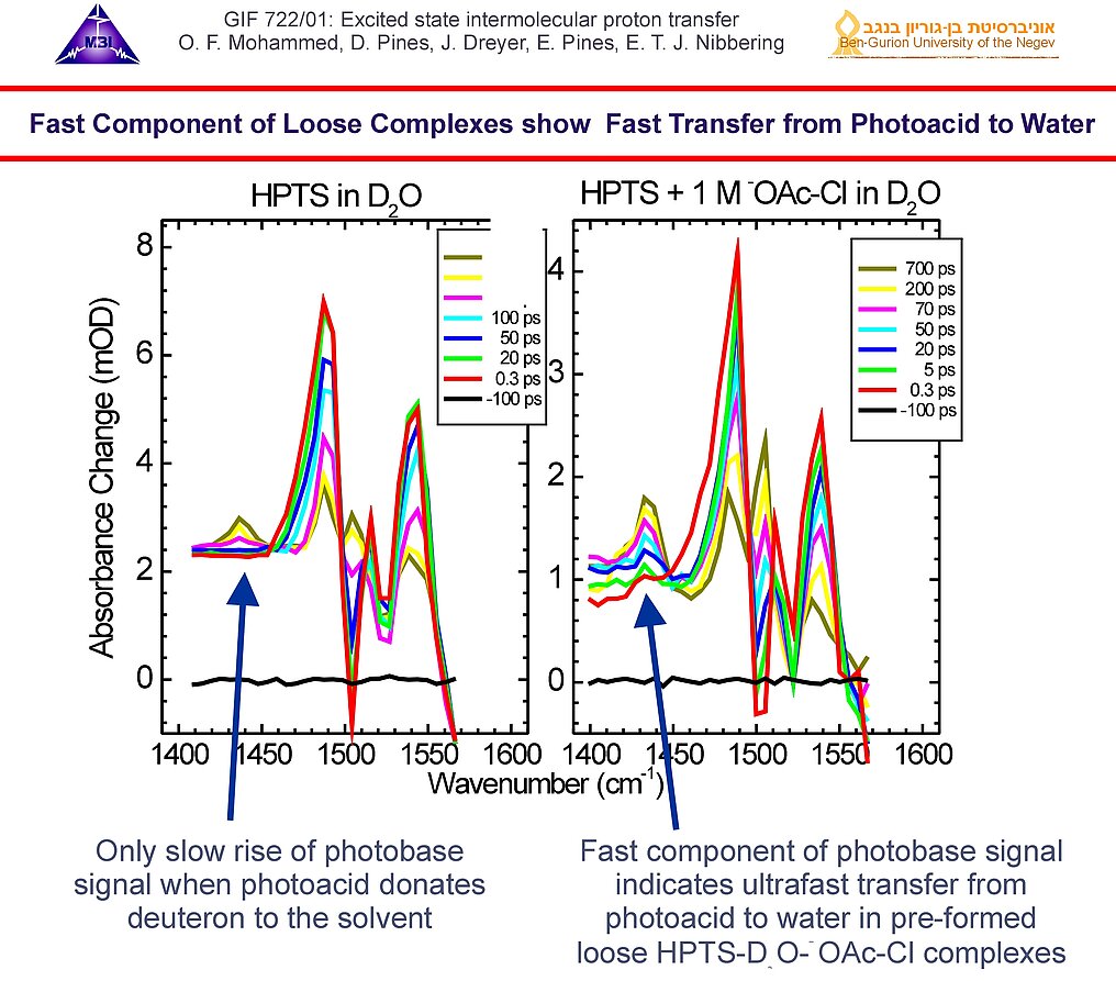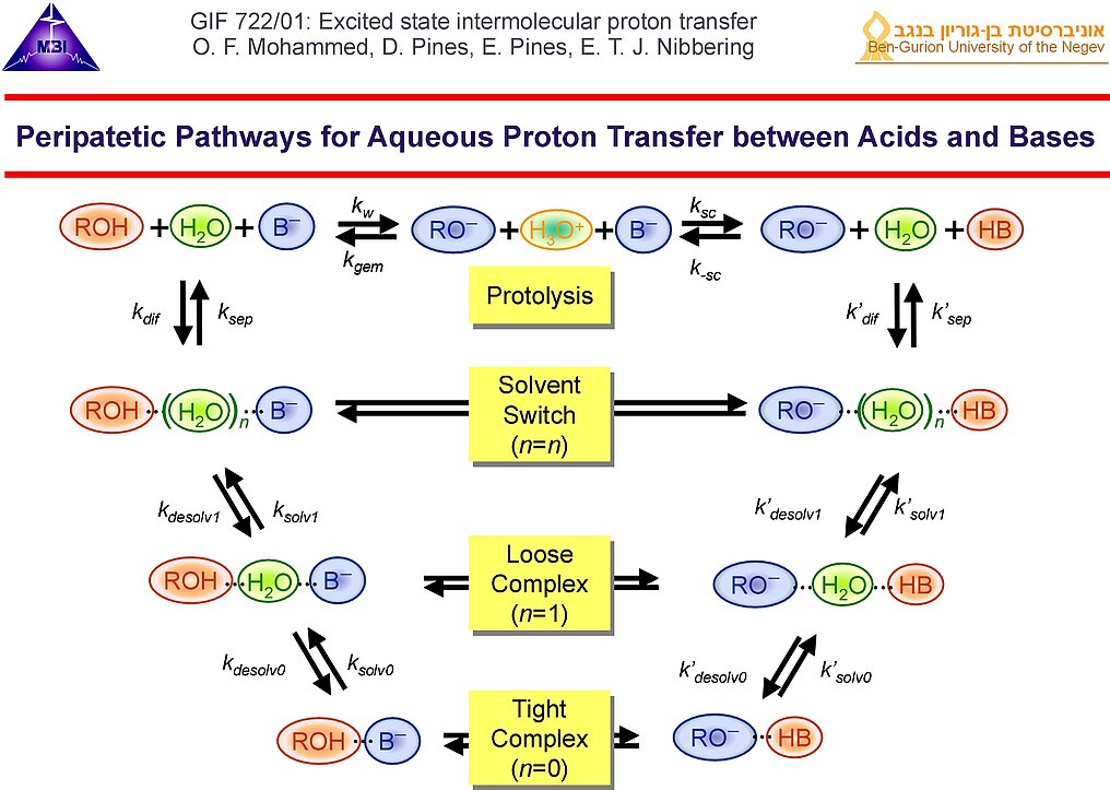 Bimolecular proton transfer reactions in liquid solution has been explored since 2000 (more details see link). For either case the interplay between molecular diffusion and reaction dynamics of on-contact complexes has to be taken into account. Femtosecond IR spectroscopy has provided key insight into different stages of aqueous proton transfer between photoacids and bases, taking place in a sequential von Grotthuss-like mechanism. This research was in part funded by: German-Israeli Foundation for Scientific Research GIF-722 jointly with E. Pines (2003-2006) and GIF-876 jointly with E. Pines (2007-2009).