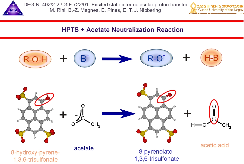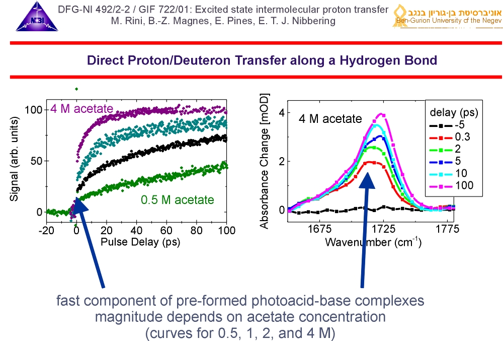 3. We have used 8-hydroxy-pyrene-1,3,6-trisulfonate (HPTS) as photoacid and acetate as base., dissolved in deuterated water. We excite the photoacid with a 400 nm pump pulse, and follow the dynamics with an IR-pulse tuned to marker modes of the photoacid, of the conjugate photobase and of acetic acid, that is formed when acetate accepts a deuteron. We thus follow the reaction two sides: the photoacid/photobase (telling us when the deuteron leaves the photoacid) and the product acetic acid (telling us when the deuteron arrives at the base acetate).
