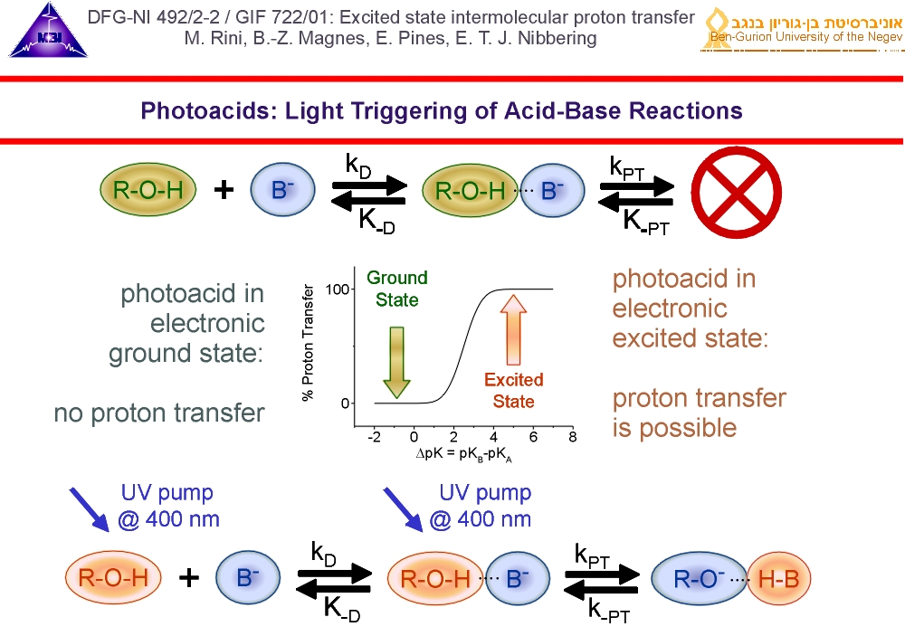 2. Photoacids are ideal systems to study the proton transfer dynamics in real-time. When in the electronic ground state proton transfer does not take place when the difference between the pKa-values of the conjugate acid HB and the photoacid R-OH is smaller than 2. When photo-excited, the pKa -value of the photoacid drops with values between 5-10. Proton transfer is then made possible by the optical trigger pulse.