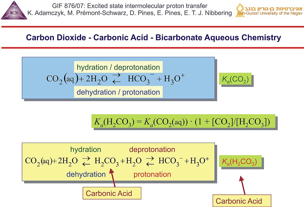 11. Aqueous carbon dioxide chemistry is usually described using an equilibrium between CO2/H2O and HCO3-/H3O+, with the effective acid dissociation constant Ka(CO2) for which pKa = 6.35. In reality the hydration/dehydration and deprotonation/protonation steps have to be treated separately, with carbonic acid as intermediate. Carbonic acid has not been directly observed in aqueous solution, and as a result the real acidity of carbonic acid has only been roughly estimated to be pKa ~ 3.6 .