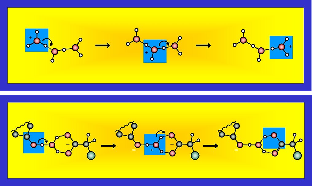8. Schematic comparison of the von Grotthuss hopping mechanism for proton conductivity in water (top) and the proposed proton hopping mechanism in the neutralization reaction between the photoacid HPTS and the chloroacetate base, separated by one water molecule.