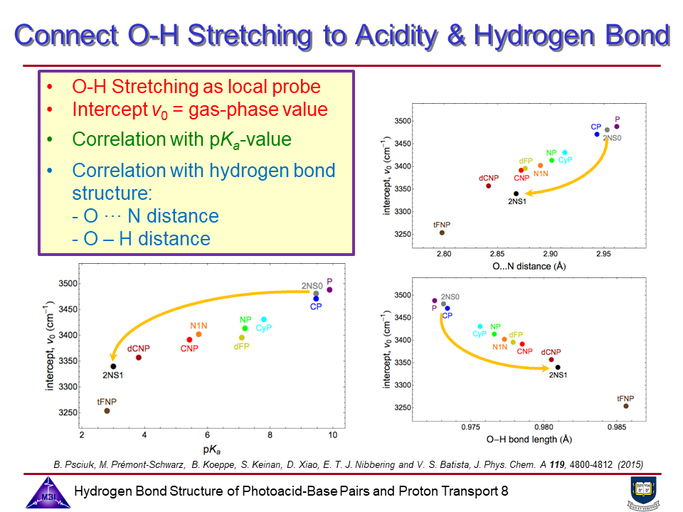 Hydrogen bond structure of photoacid-base complexes and proton-coupled electron transfer (PCET) has been studied in a combined experimental and theoretical approach jointly with the Batista group (since 2011).
