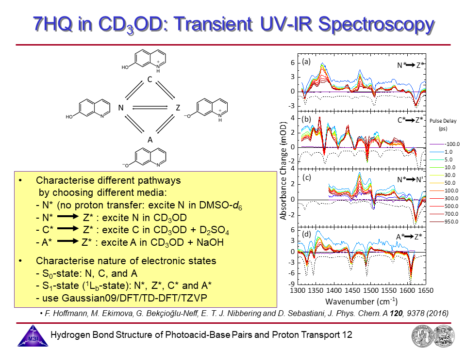 Proton transport along hydrogen-bonded solvent bridges connecting acid and base sites of bifunctional photoacids has been studied in a combined experimental and theoretical approach in a collaboration with the Sebastiani group since 2014. This research is funded by the Deutsche Forschungsgemeinschaft (DFG Normalverfahren NI 492/13-1 / SE 1008/11-1 jointly with D. Sebastiani; 2015-2017).