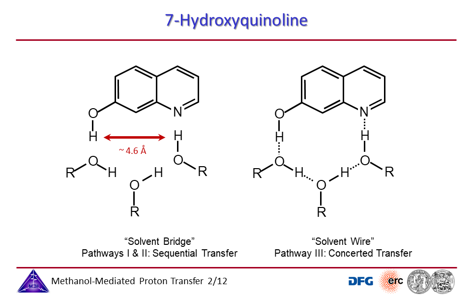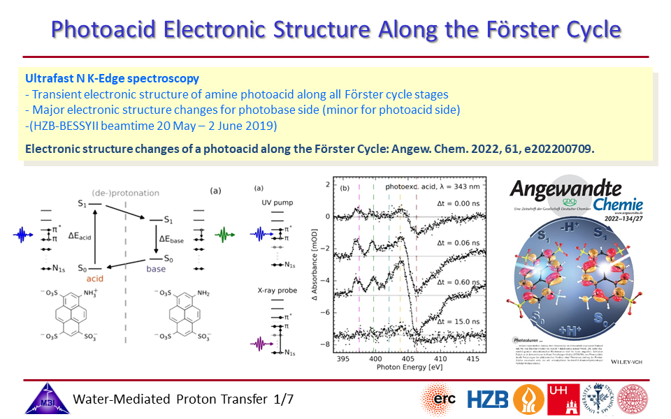 Photoacids are used to investigate the elementary steps in water-mediated proton transfer reactions. IR and soft-x-ray spectroscopy are used as local probing tools on transient vibrational and electronic structure. Femtosecond UV-pump/IR-probe spectroscopy is used to follow the response of the photoacids, hydration shell water and bases during different stages of the proton transport. Soft-x-ray spectroscopy using flatjet technology is used to explore hydrogen bonding interactions of photoacids and bases, and will be further developped as technique probing hydrogen bonding interactions on ultrafast time scales. Proton transport along hydrogen-bonded solvent bridges connecting acid and base sites of bifunctional photoacids has been studied in a combined experimental and theoretical approach since 2015. This research is in part funded by a DFG Normalverfahren NI 492/13-2 / SE 1008/11-1 jointly with D. Sebastiani (2015-2017 and 2021-...). Since 2018 third party funding comes from an ERC Advanced Grant (XRayProton, Nibbering, 2018-2023).