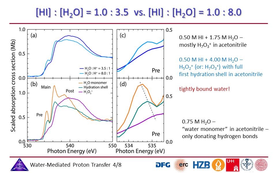 1.4. [HI]:[H2O] = 3.5 vs. [HI]:[H2O] = 8.0 mixing ratios: contributions of inner protonated water complex modified by strong orbital interactions and of hydration shell water molecules.