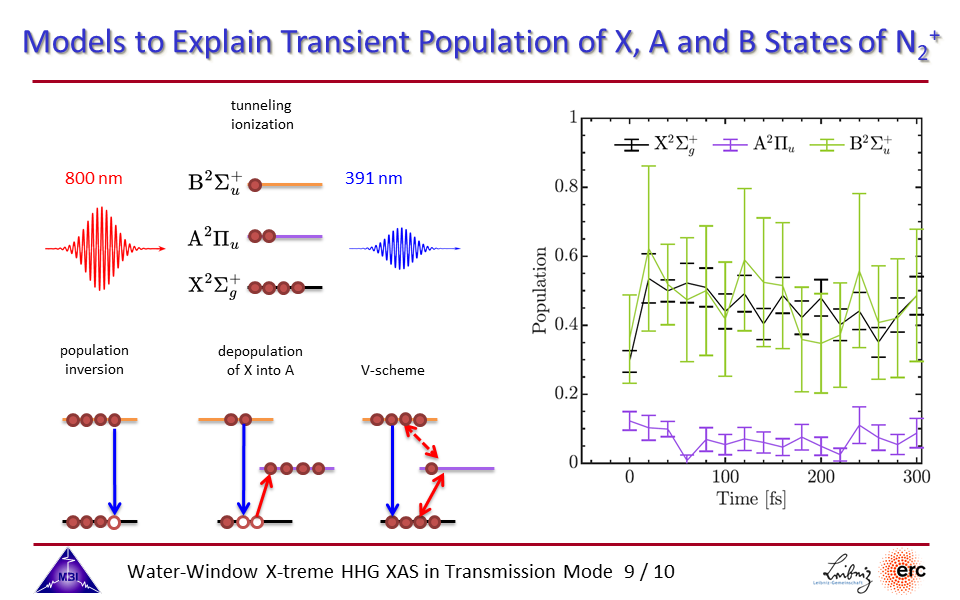 9. Models to explain the observations the observed population dynamics: population inversion between B and X states, depopulation of the X state to intermediate A state, and coherent coupling between the X, A and B states.