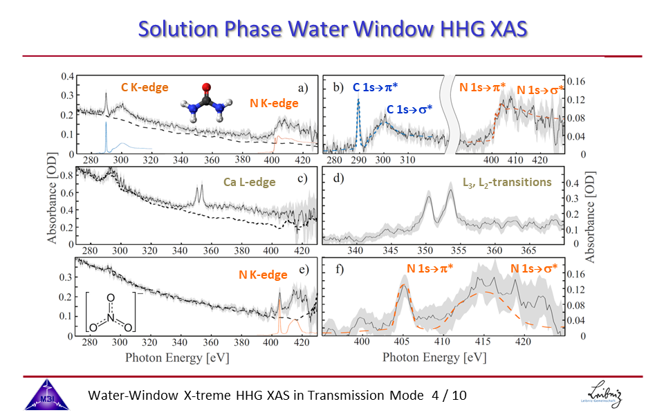 4. X-ray absorption spectra measured for particular solutes in the water window, depicted as solid black lines. Dashed lines indicate the solvent water only response. Blue and orange thin lines are spectra measured at the BESSYII storage ring facility. These reference measurements have been convoluted with the spectral resolution of the HHG set-up spectrometer, for a direct comparison between the XAS HHG and BESSYII carbon and nitrogen K-edge results in the spectra shown in the right column.