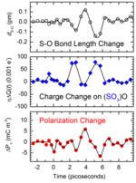 Fig 3: Upper panel: Change of the S-O bond length as a function of the delay time. The maximum change of 0.1 pm is 1000 times smaller than the bond length itself, i.e., the atomic motions cannot be observed in Fig. 2. Middle panel: Charge transfer from one oxygen atom to the SO3 group of the sulfate ion (left black arrows in Fig. 2) as a function of delay time. Lower panel: Change of the macroscopic polarization P along the c axis which is the sum of all microscopic dipole changes of the local S-O dipoles within the sulfhate ions (red and blue arrows in Fig. 1 bottom right).