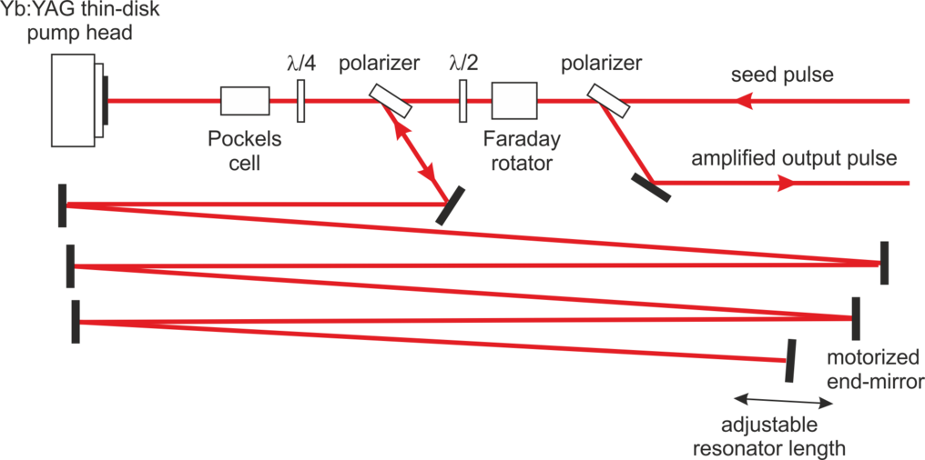 In the resonator of the regenerative amplifier the Yb:YAG thin disk is used as one end-mirror. Additional spherical mirrors in the cavity are used to adjust the beam diameter on the disk to the pump beam diameter. Fig. 10 shows a sketch of a typical setup of the regenerative amplifier.