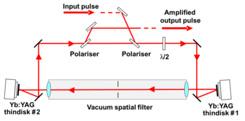 The thin-disk laser technology allows for lasers with high pulse energy (several hundred mJ to Joule level) and repetition rates of up to the kHz level. A disk with a thickness between several 100 μm and 1 mm is used as the active medium. Compared to laser rods, the cooling efficiency of thin disks is much better, which allows for a higher repetition rate. The output energy is in principle scalable with the disk diameter.
