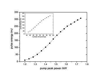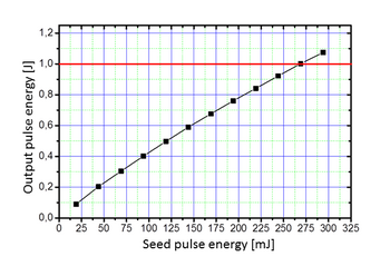 Pulse energies of more than 1 J have been reached on an experimental basis. For daily operation about 400 mJ pulse energy (ns pulse) corresponding to 300 mJ in a compressed ps pulse could be used.