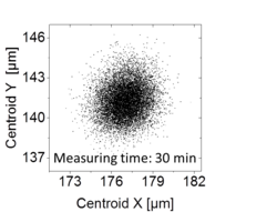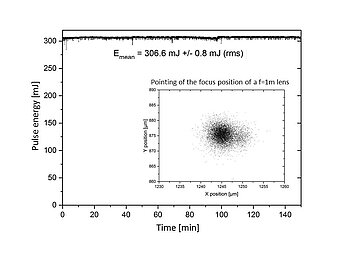 Fig. 11 shows the output pulse energy vs. pump power for a regenerative amplifier. A maximum output energy of 307 mJ could be extracted at a pump power of about 1.75 kW and 56 round-trips. This corresponds to an optical-to-optical efficiency of more than 17%. An excellent stability below 0.3% rms (s. Fig. 12) was measured over a period of about 2.5 h. The output beam is highly collimated. An M2 measurement resulted in a value of better than 1.2 with a minimum focal spot size of 80 μm at f = 300 mm. The pointing stability behind a f = 1 m lens is +/- 2 μm (rms), measured over 30 min.