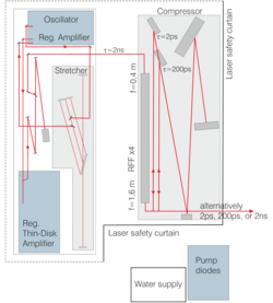 Both laser systems have a similar layout. They consist of a front-end with an Yb:KGW oscillator, a grating stretcher, and an Yb:KGW regenerative amplifier. The front-end delivers laser pulses stretched from about 200 fs to 2 ns with 0.5 mJ of pulse energy. These laser pulses are further used to seed a regenerative amplifier based on Yb:YAG thin-disk technology.