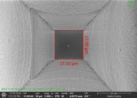 We prepare transparent windows of several 10 μm size and sub-micrometer thickness with a combination of mechanical grinding and polishing, and focused ion beam (FIB) milling. Depending on the experiment, these windows may then be further processed into FTH samples.